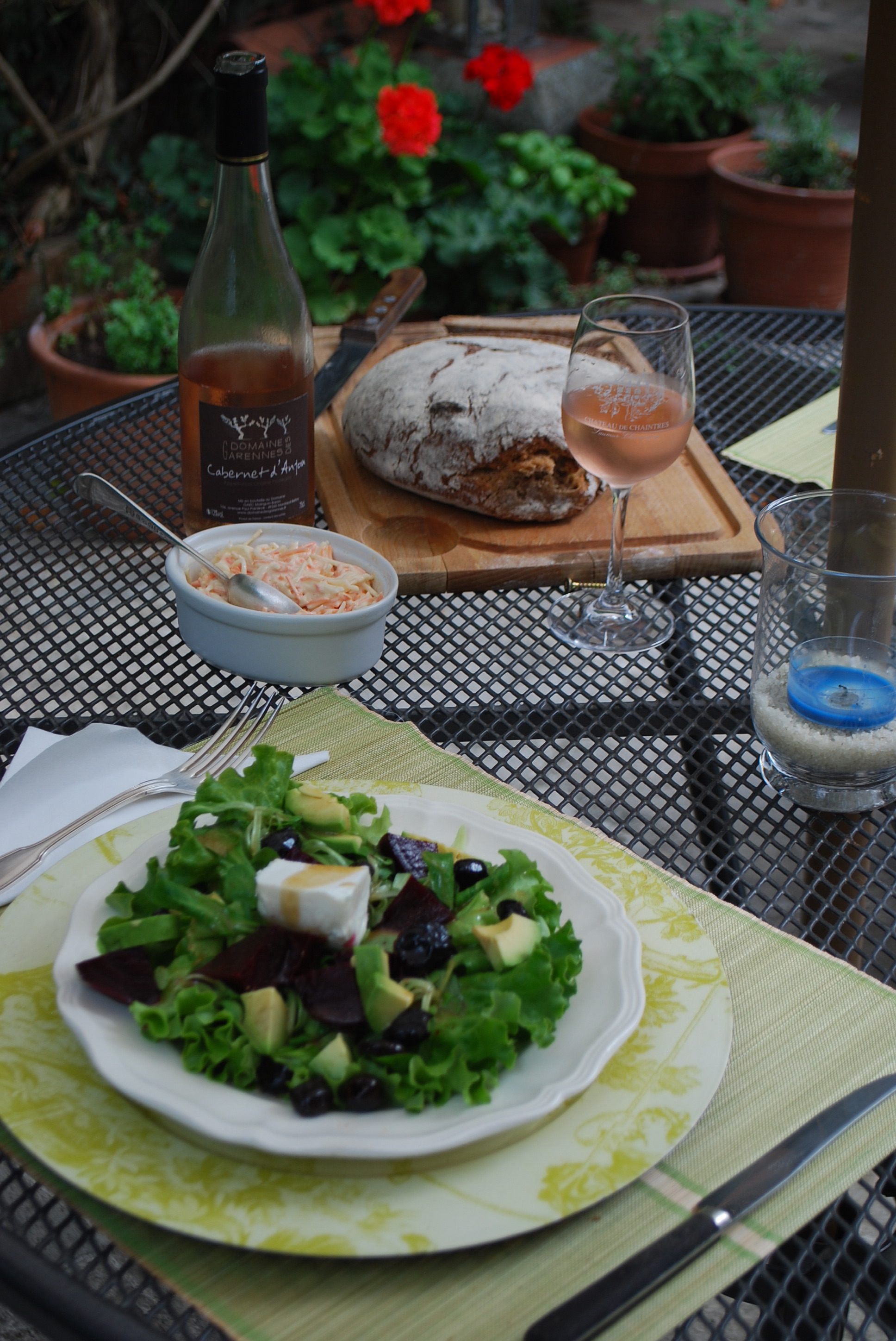 I have the privilege of being enveloped in a cozy cream and Indian red striped bed linens, complete with soft and squishy pillows, wonderfully aged wooden floors, and natural linen tie back drapes which hang elegantly onto the floor. What a terrific place of relaxation. I am so comfortable , and oh so grateful to be here in this place of rest. We have enjoyed delicious wine tasting, toured an exquisite chateau, and taken some wonderful walks about the town. This morning after we had ventured to the local market, we came back to this picturesque spot, and enjoyed a salad with goat cheese, beets, black olives, and avocado. It was finished off with a light vinegrette which made the taste buds simply tingle. We paired it with a slightly sweet local rose from our trip to the winery. Such a luxury, and of course, so enjoyable to spend time with my sister in law, Cay, and Janette.