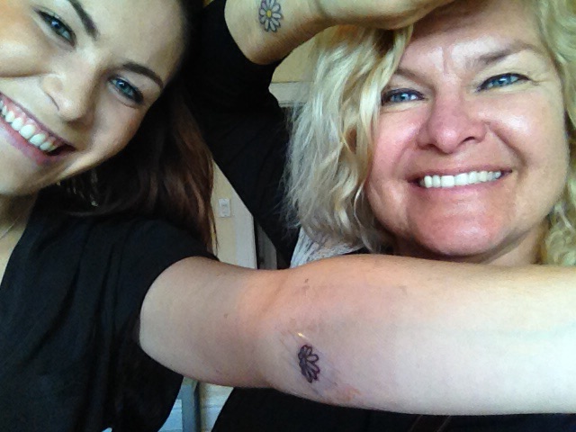 The other day I planned to get together with my niece Maddie who is attending Ryerson University in Toronto. I wanted to see her apartment downtown, and “do lunch together.” I just really wanted to be in her sweet presence. She is a statuesque, lovely girl with a warm smile, infectious laugh, and she is filled with possibilities for her future. She is fantastically talented, and bright with a vision to change her world and make it better, more hopeful. She is part of a vision called “girl empowerment project”, which is a non profit organization by Reel Media. Reel Media is a student production company with Ryerson University. I think it is fantastic. She seems to create in these young girls a bright hope for their futures, letting them in on the concept that anything is possible. She encourages them to dream big, and without compromise. I love this..and her so much. We decide to meet, and she let me in on the fact that she had been thinking of getting a tattoo of a daisy in honor of Bianca.. I was so thrilled to hear that, and my heart was full. She asked if I might like to join her. I explained that not only did I want to join her, but could I get one too? She was somewhat surprised. She asked if I really wanted to, and I told her that I always had thought of getting a daisy tattoo for my little Beetlebug girl. She was excited, as was I, and so our plan went into action. We met, embraced, and were giddy with the prospect of sharing this together…Just wow…it was so special. I will hold this day in my heart and mind of being one of the best days ever! We comforted one another as the artist was creating his masterpieces on our arms, and giggled and smirked into one another’s’ eyes with the knowledge that we were sharing a sacred and beautiful moment. Man..I just live for these moments when life takes your breath away…. These are the times we live for..we crave..the inner connection of our souls. We reach out, and grab hold, we share life…and it is so blessedly good. It is awesome to touch that which makes our lives come alive..I live for this..I love it. People are infinitely precious and unique. When getting “tatted” with Madison, “marked for our Bianca,” I couldn’t help but wonder what Bianca would have thought about all this. Would she understand that her Mum is slightly cray cray, and needs desperately to feel as if she is carrying a part of her with me into all eternity? I need to look at my wrist, to kiss it, and to know yes…she was here..she mattered..I loved her with all of my heart, and I shall never..ever..ever forget the most incredible, special gift of a little daughter who turned my world upside down, blew her family’s’ world apart with her passing, and yet managed to make us whole and better for having known her, and shared in her life….thank you Maddie for warming your Auntie’s day, for wanting to do this with me…..you made it hurt just a little less, and I adore you for it. Keep shining your light dear girl, for it is a bright one, and I look forward to seeing your vision come into fruition.