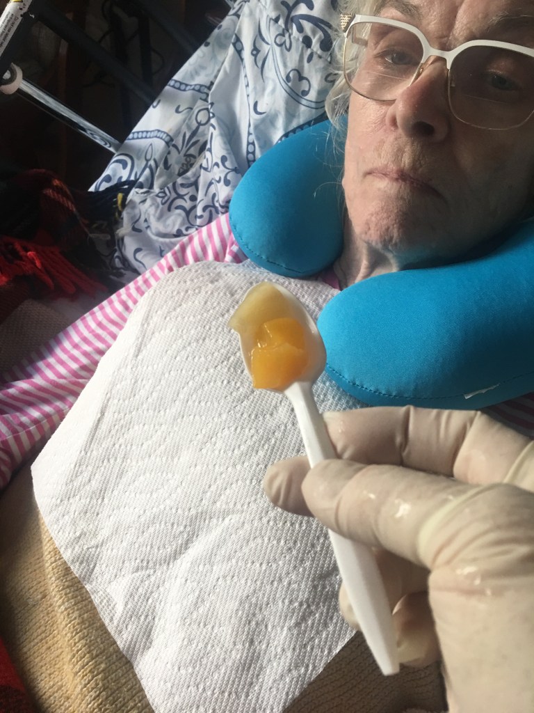 Mum is no longer mobile. Thus far she will not stand up, or attempt to walk, and she is re positioned in her bed every two hours. I think it’s possible I’m in mechanical mode, and caring for her in a professional manner, but also attempting just about anything to elicit a smile, or giggle to make her days brighter.
