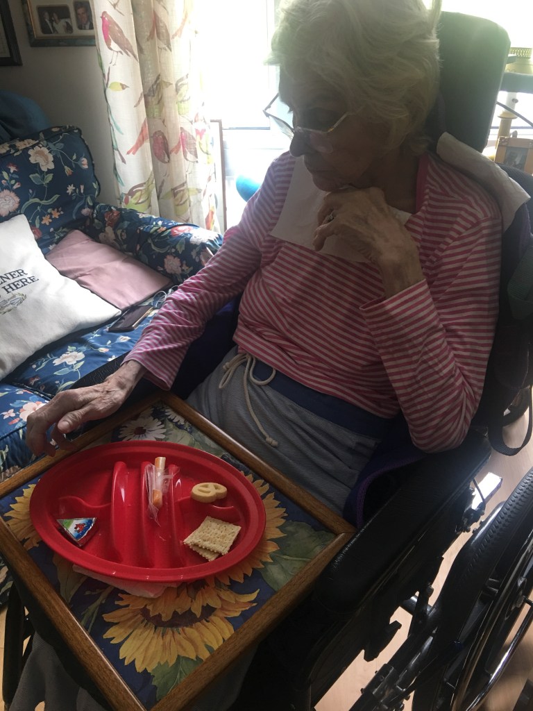 At noon we lift her via hoyer lift into her wheelchair, and shortly thereafter lunch is served.. She is not eating much. Her inner thoughts are kept to herself, and at these times she seems very far away, in her own world.