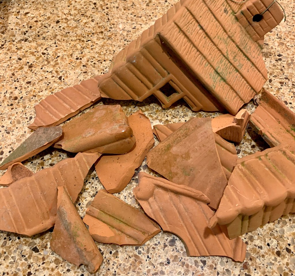 The other afternoon I was swaying on their hammock in their quaint oasis of a back yard, and all of a sudden, a Clay house bird feeder came toppling down to the ground. It was so random….or so it seemed. It had been hanging from the pergola in the back yard for 2 and a half years..seemingly unaffected by the elements. It had endured being blown, knocked, rained and snowed upon….