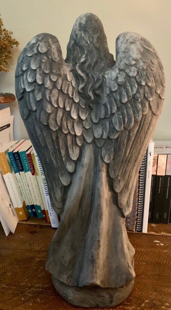 The thing, as it turns out was a cast aside Angel . She was in perfect condition. Why had someone discarded her? There was a story to tell. I was stunned. Her hands were placed over her heart in the most reverent, and promising way .