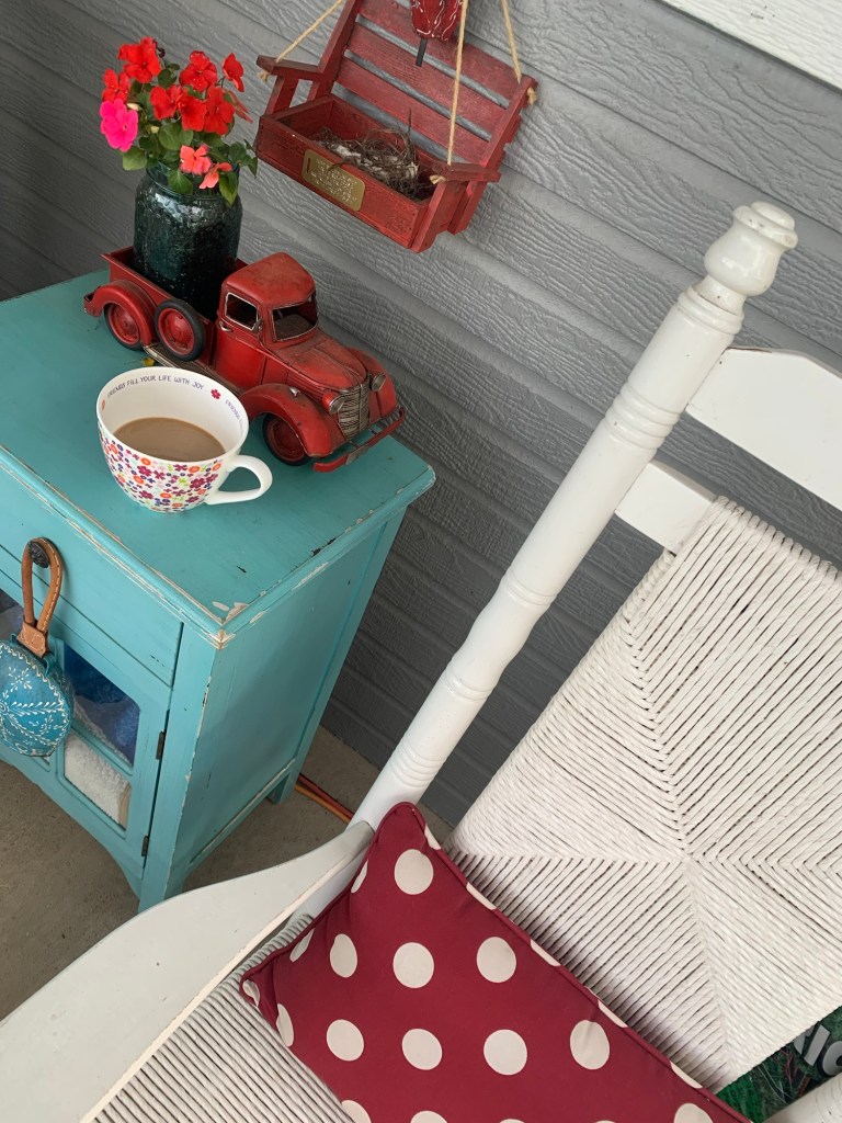 All of it, from my white slightly paint chipped white rocking chair, to the cup of coffee and cream from an oversized tea cup, I take it in, and attempt to not miss a thing. My cup overflows with gratitude of the being in the here and now . The dizzying freshness of it all.